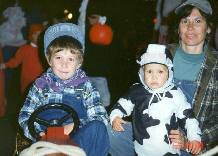 I sewed many of our costumes through my sons childhood years and we took advantage of other ways to participate in the festivities. The public school had annual Halloween parades and the town of West Chester, PA hosted a community parade every year. My favorite Halloween memory is the year we entered the West Chester Halloween Parade as a “farm family” with hubby Jim helping to “power” the tractor! Ya gotta love the old funky flash photography and red-eye imagery!