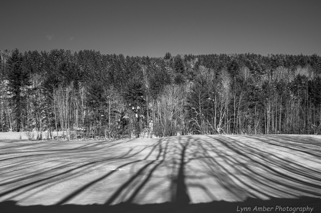 My neighbor logs during the winter on family land that surrounds our property. His log pile keeps growing and growing! With the snow resting on the logs and the bright sunshine, I thought this photo would render well in black and white.