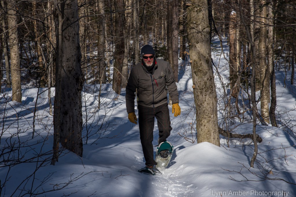 I am generally a faster hiker than Jim and often get far ahead and wait for him to catch up – which is the reason I have so many pictures of him approaching the camera! He was walking slower than usual this day due to issues he was having with his snowshoes. He swears that the boot strap area is twisted – therefore making it difficult to “walk” correctly. We stopped to enjoy the view and Jim examined his “defective” snowshoe.