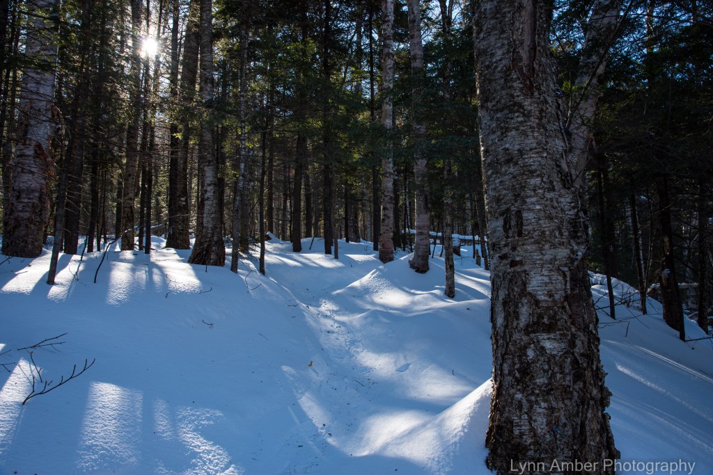 Some of the groomed trails are strictly for use by skiers and snowshoers. These trails are a bit narrower than the multi-use trails and I think the idea is to keep the trails from getting messed up by heavy foot traffic. The trail below (Summer Pasture Road) is for use by skiers and snowshoers only. One side of the trail is set for traditional skiers and the rest of the trail groomed for ski skaters. We snowshoed this trail until it intersected with the Spring Lot trail and then veered off that onto the Pogue Brook Trail – which took us back to the Mountain Road.