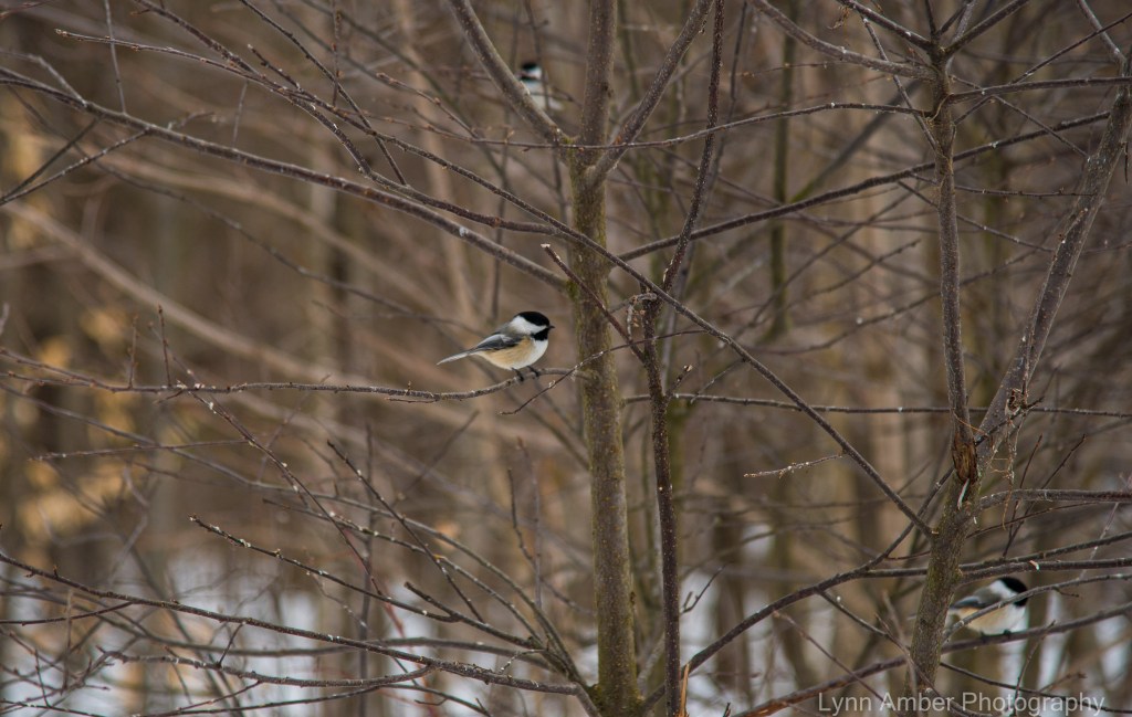 The chickadees used the nearby young tree branches as a staging area to swoop down to the sunflower seed tray