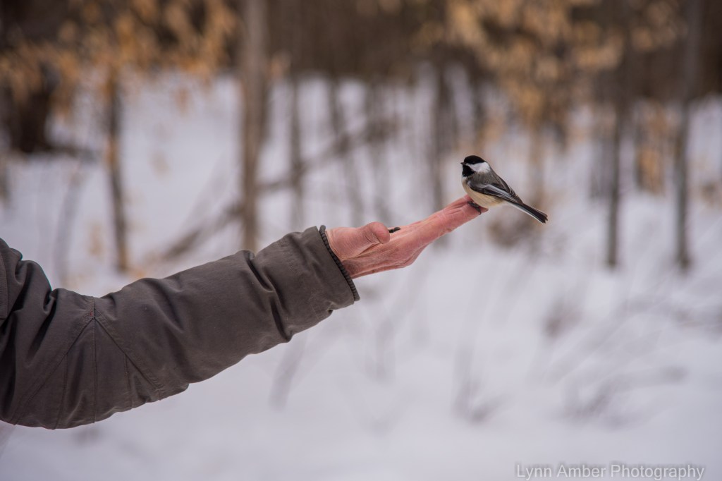 While we waited for Bill and Ella to get the horses harnessed and ready to be hitched to the sleigh, Jim and I entertained ourselves watching the chickadees swooping down to feed on the sunflower seeds that Bill provides for them.