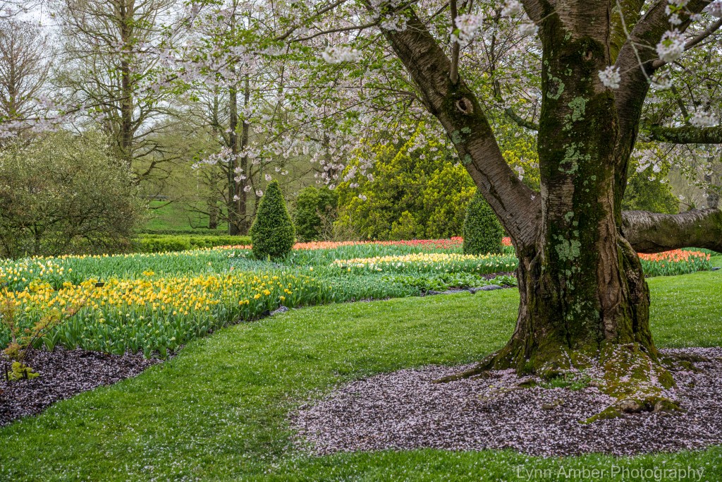 Cherry tree blossoms were showering down onto the ground at the edge of the tulip beds.