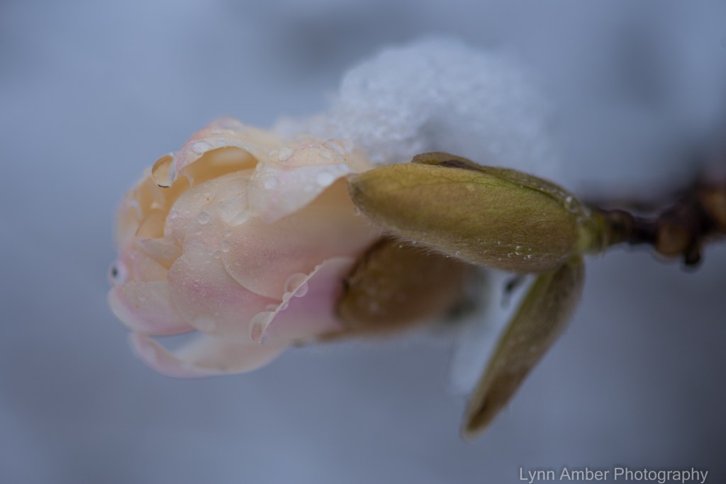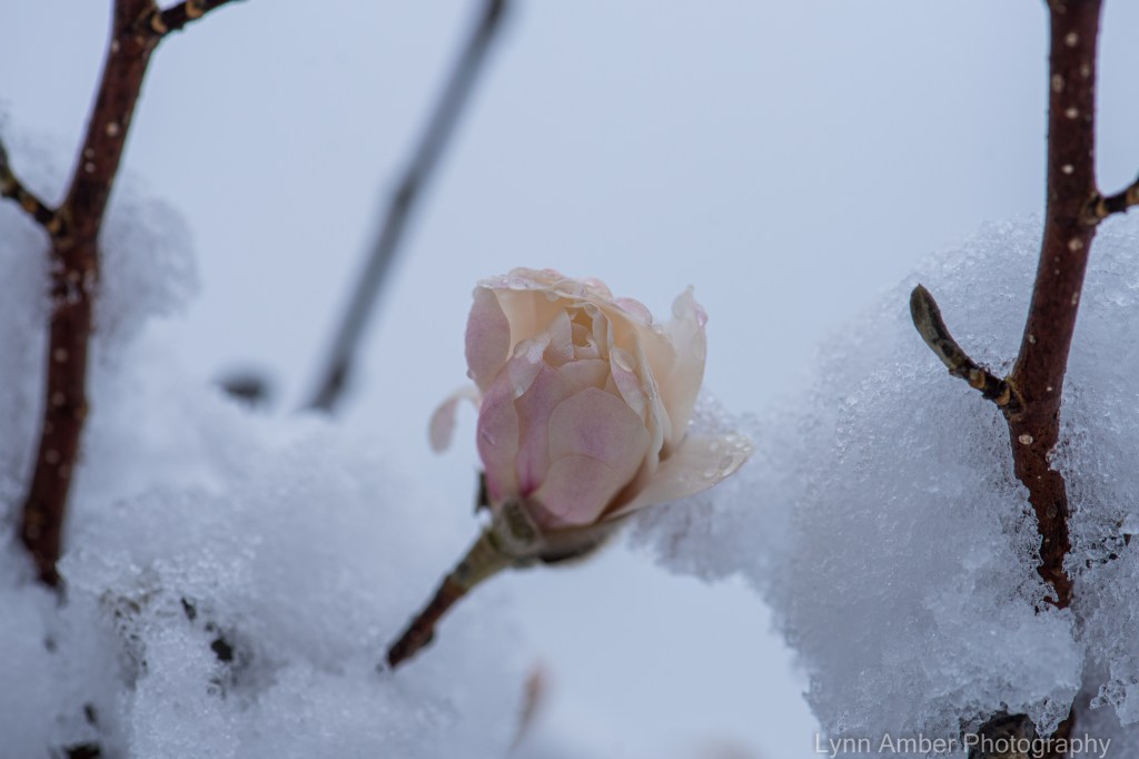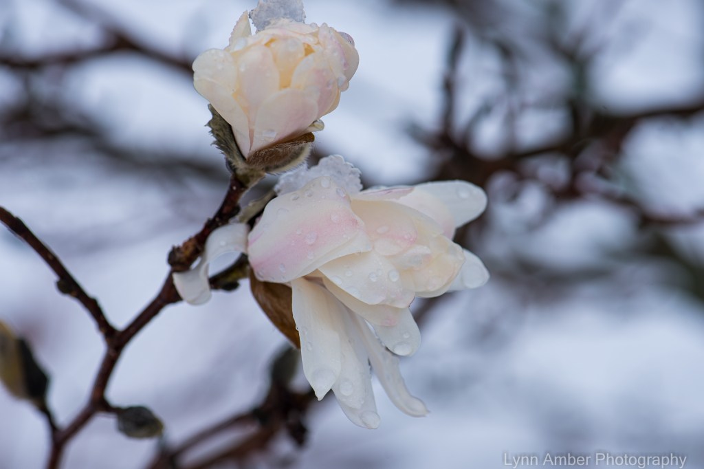 I believe a more appropriate common name for the Star Magnolia should be Snow Magnolia! Here in the north where this magnolia reaches its hardiness limit, the opening blossoms often endure late cold snaps and snowstorms that damage its buds and discolor flowers. Thankfully, our mid-April snowstorm yesterday did not bring freezing temperatures and I believe the flowers and buds survived with minimal injury. I found the snow-covered branches and flowers to be photo-worthy and managed to snap a few pictures before the snow melted.