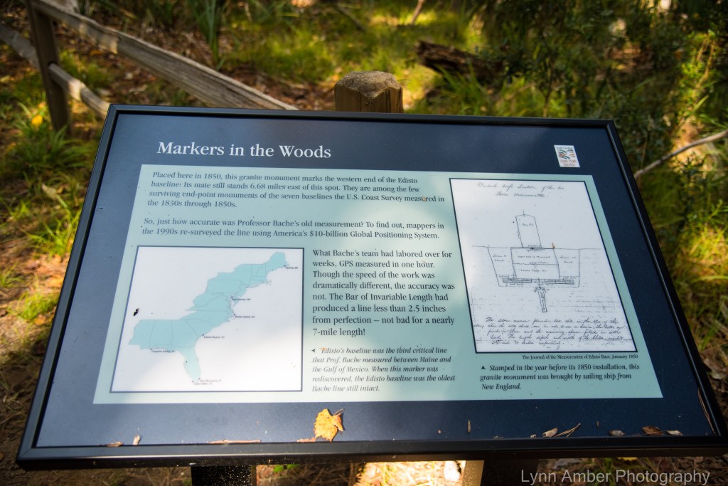 The Bache Monument Trail is a short, easy .2-mile walk that leads from the learning center to the Bache Monument. Alexander Bache was a scientist and surveyor in the mid-1850’s who was instrumental in completing a mapping of the entire coastline during his tenure as superintendent of the US Coast Survey. He was the great-grandson of Benjamin Franklin and obviously inherited the “inventive” gene. Bache developed a tool known as the “Bar of Invariable Length” that was used for this survey that culminated in measuring the entire eastern US coastline. Two of the baseline markers for this survey are on Edisto Island.