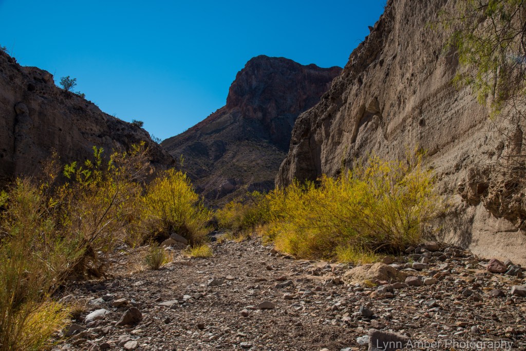 Tuff Canyon Trail is a short walk down into the canyon formed by the Blue Creek as it fought its way down to the Rio Grande River from the Chisos Mountains. Once you complete the short descent into the canyon, it’s a nice walk along the gravelly river bed floor up towards the “beginning” of the canyon. Formed through volcanic action many years ago, the canyon’s rock dates back to 29 million years ago. Tuff is volcanic ash that has hardened into rock and is light in color – hence the almost “white” hue to some layers of the canyon walls. It’s interesting to note the texture of the “tuff.” Embedded in the tuff are harder rocks that gives it a “concrete-like” appearance with pebbles and small rock mixed into it. We noticed holes in the surface of the canyon walls and wondered how they were formed. I read that the tuff erodes easily and allows the small rocks to fall out of the wall leaving a hole in the wall!