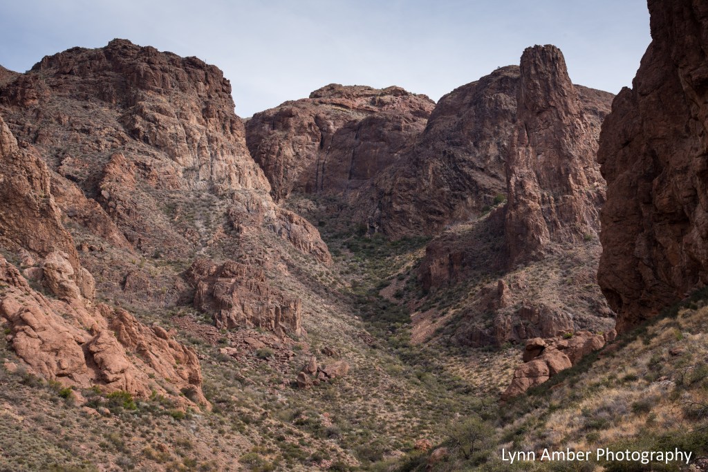 As we were climbing and negotiating the switchbacks, I kept looking backwards towards the view down the canyon. In the distance on the desert floor, the wash we hiked as part of the Estes Canyon trail is visible winding through the canyon.