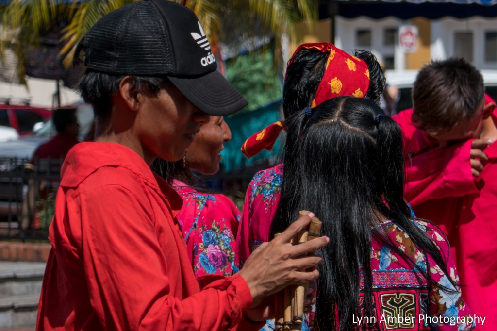 There were a group of indigenous youth who were performing a dance routine in the square and playing what looked and sounded like a type of recorder.