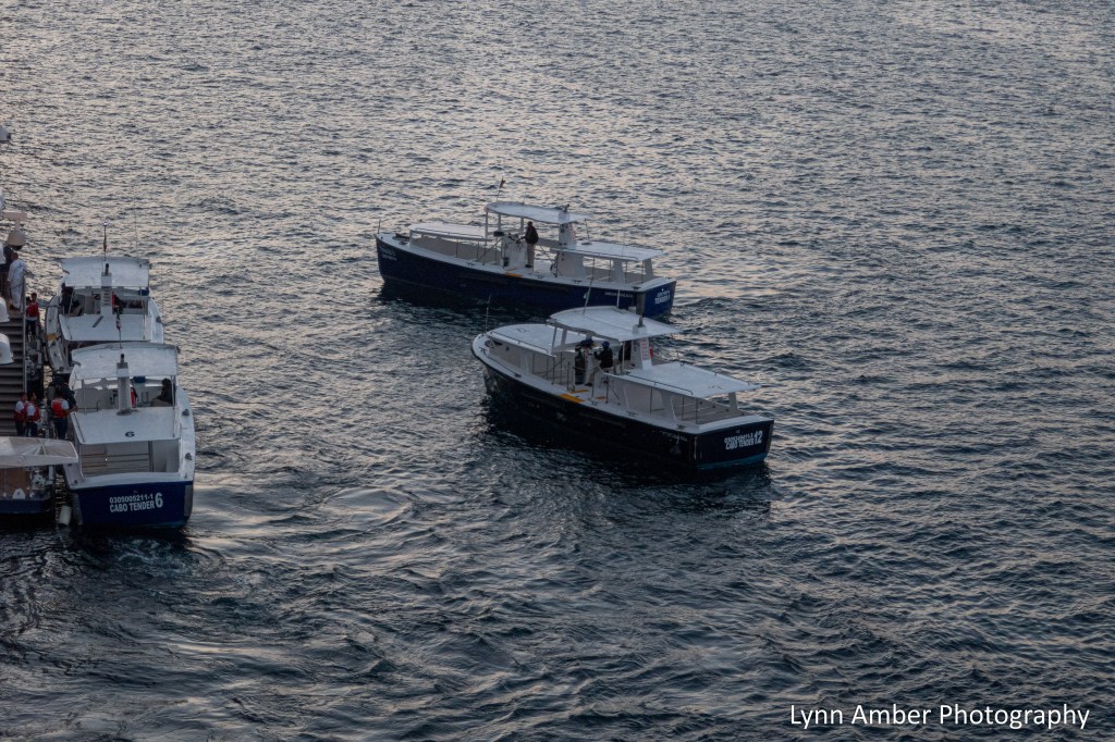 Cabo San Lucas was the only port that we could not dock right at the port. We anchored off shore and the passengers were escorted to land via “tenders.” I managed to get a picture of them as they were dropping off and picking up passengers.
