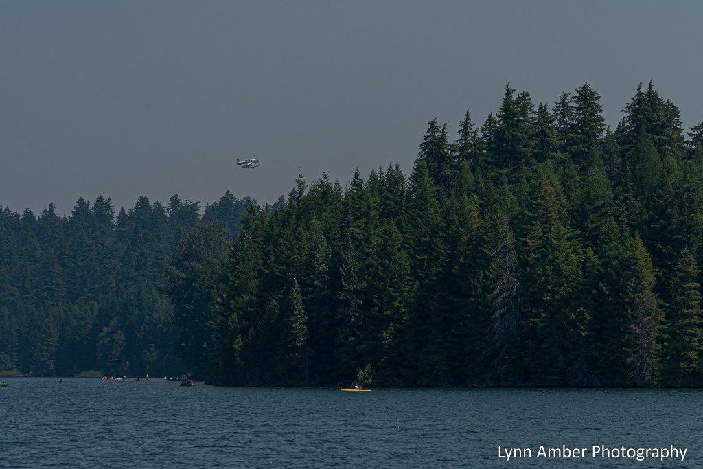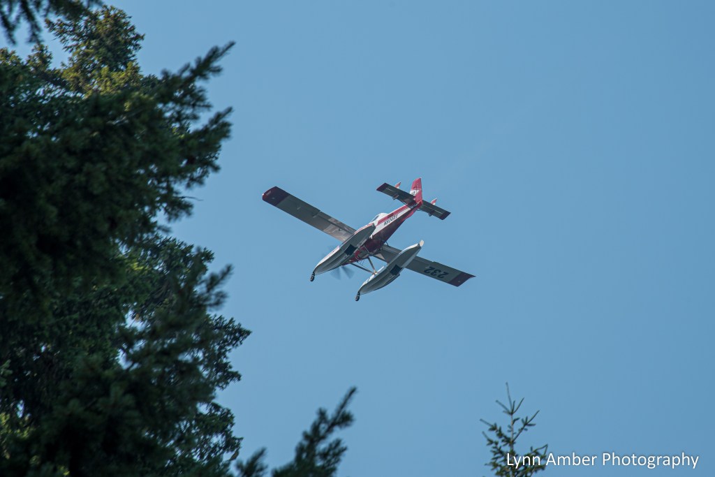 In the background above, you can see one of the pontoon planes starting to lift off after filling with water. The planes have hatches that open and allow the pontoons to scoop up water. It’s amazing to watch these pilots skim the surface of the water, load up their pontoons and, then, proceed to lift up and get above the tree line. Their piloting skill is remarkable!!
