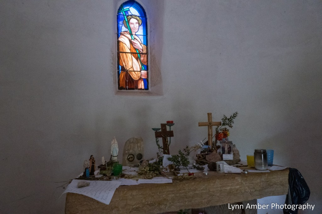 The interior was pretty sparse with some benches for sitting and resting. I was not the only pilgrim who was dodging the rain here!! There was a table inside where pilgrims left various items. Legend indicates there is a small spring near the church. The water flowing from this spring supposedly offered relief from rheumatism.
