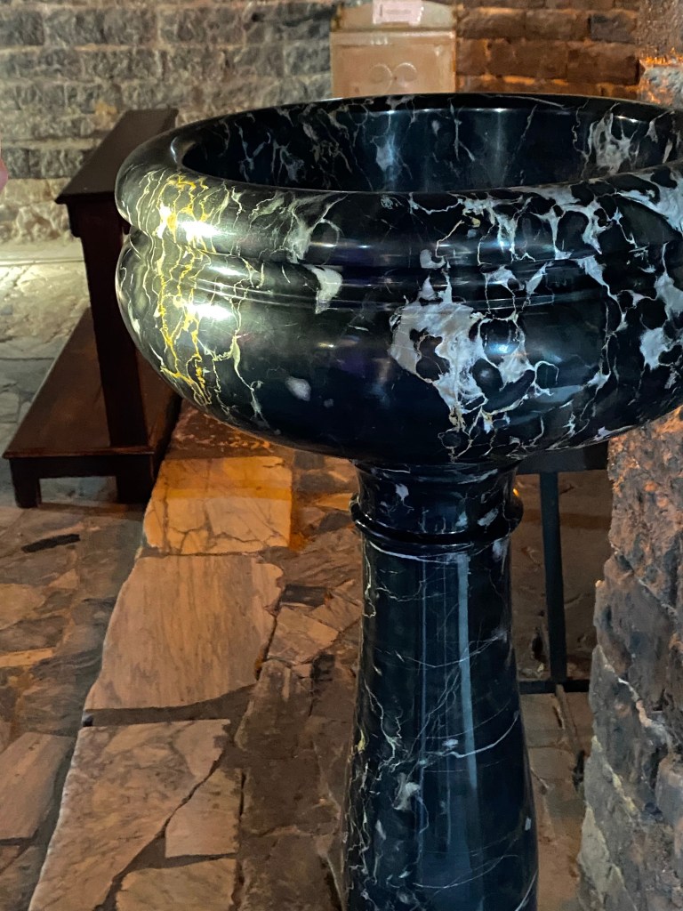 Palmaria Island gets its name from the Latin – Balma – which means “cave”. The island is reknowned for its sea level caves on the steep, western coast. The most famous cave is the Grotta dei Colombi. Archeaological artifacts found in this cave suggest it was inhabited during the Ice Age. These artifacts are on display at a museum in Le Spezia. Another important activity on the island was the mining of Portoro Marble. It was extracted on the island and is a high-end marble – black with striking gold-colored veins. We will see examples of this type of marble throughout our trip.