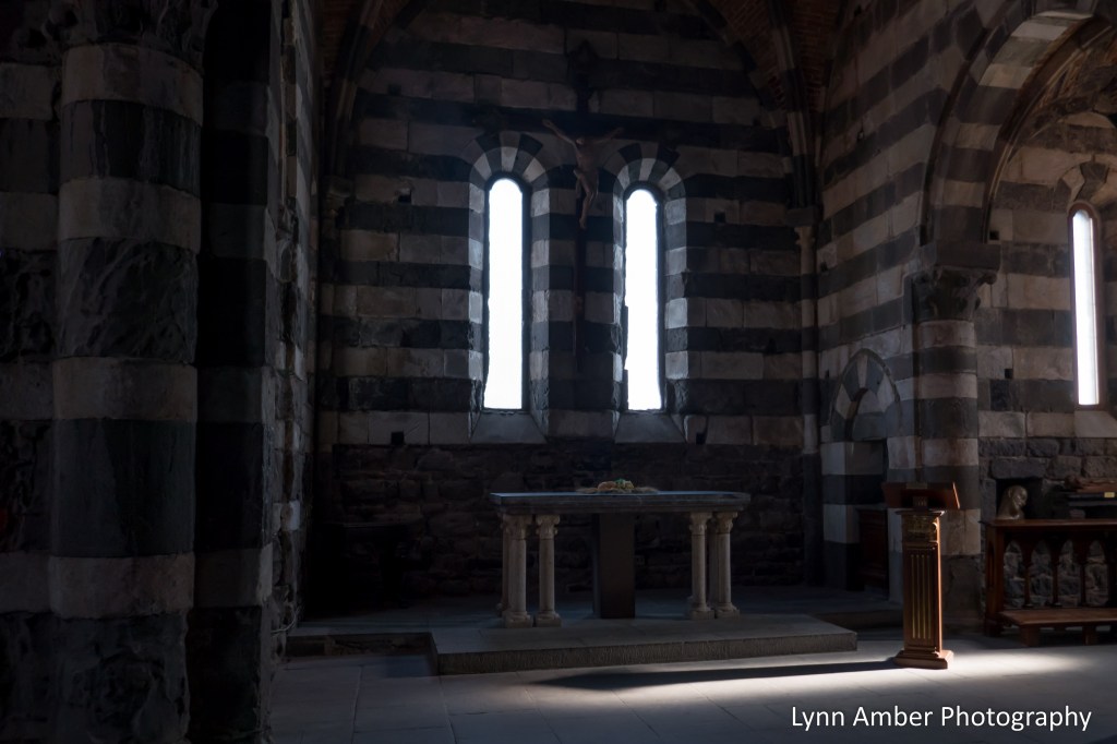 After returning to Porto Venere, we did a walking tour of the town visiting some of the local landmarks. Our first stop was the Chiesa di San Pietro – San Pietro Church – built in 1198 on a rock outcropping at the entrance to the gulf. It was built on the ruins of a Roman temple dedicated to the goddess Venus – and this is where Porto Venere’s name is thought to have derived. The architecture is of the Genoese Gothic style with it’s characteristic black and white bands of stone on the façade.