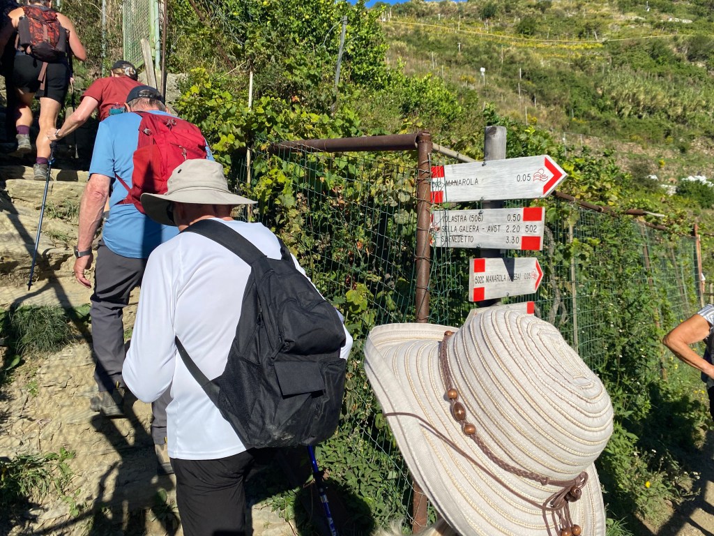 We stopped at the point where the trail starts its descent into Corniglia and Boris explained to us what the numbers on the trail signs meant. I had assumed that the numbers opposite the destinations on the signs were distances. That’s usually how it works, right? But it seemed off. He told us that the numbers represented time not distance. So, according to the sign below, Volastra was 1/2 hour behind us and Corniglia was 1 hour ahead of us. The 3-digit number on the sign “586” represents the trail itself which are represented by numbers in this region.