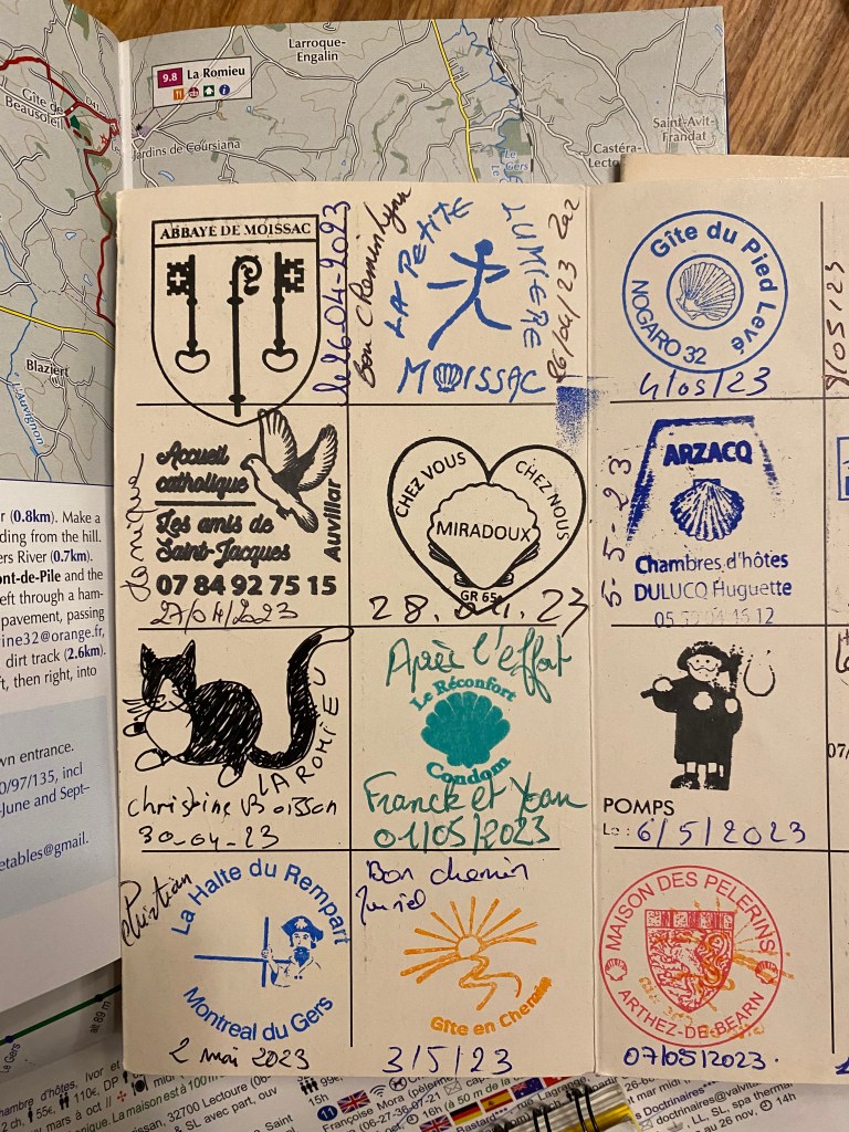 When our host, Christine, stamped our pilgrim passport books I was surprised that she did not actually have a “stamp” as most accommodations did. Instead, she drew a picture in our pass book and dated it by hand. I thought the picture that she drew curious and wondered why she chose that particular item to draw. Having read now about the legend of the cats – it has suddenly become perfectly clear!! Ha!! Can you spot the “stamp” from Chambres d’hôtes Boisson??